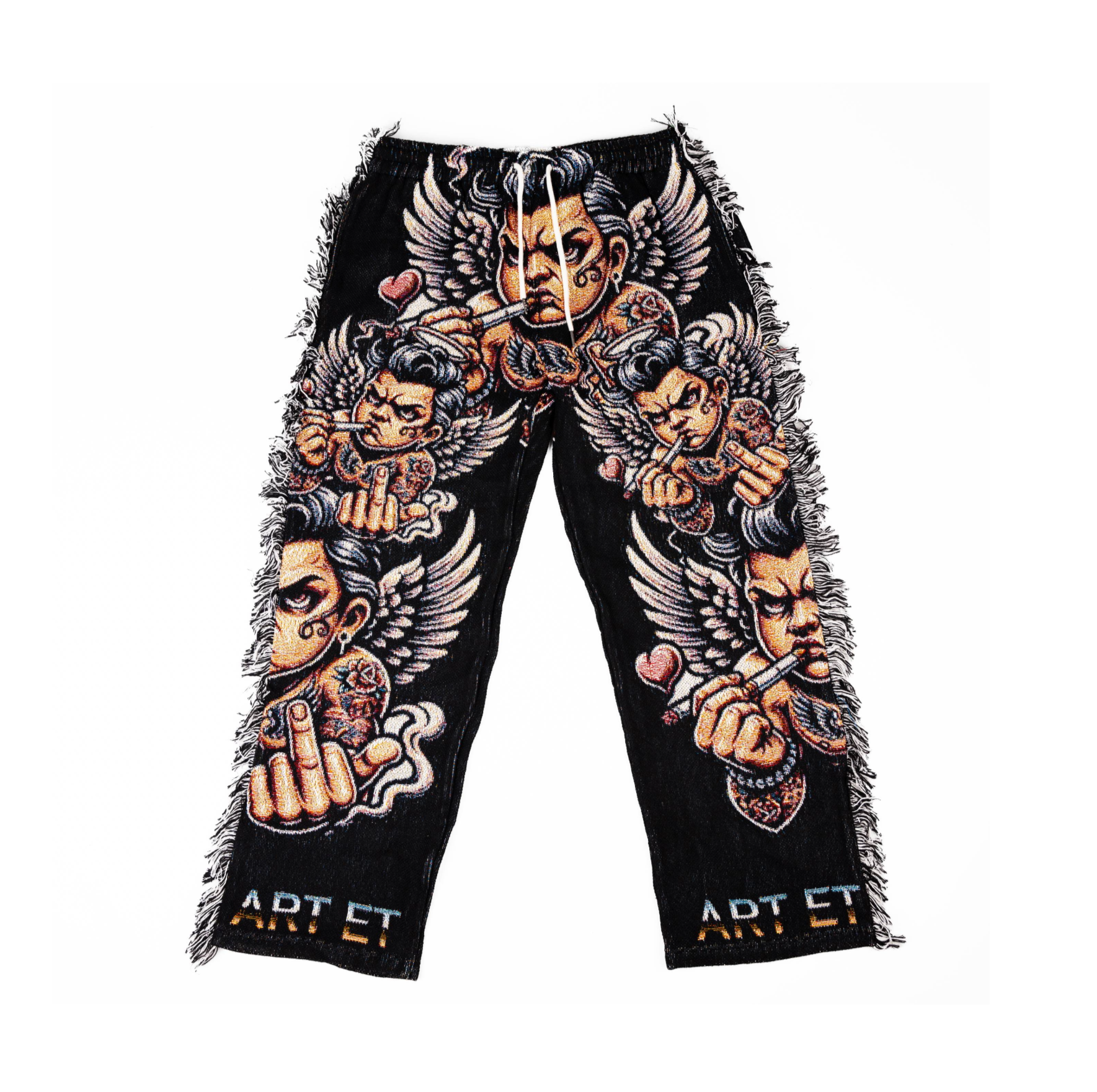 Subtle affection fringe pants features a cupid stressed out with love but leaves room for love. The fabric is made with a baggy like feel tapestry that is comfortable to wear in all weather